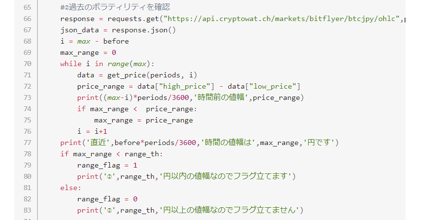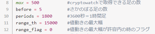 cryptowatchにアクセスして過去の価格情報を取得し、JSONデータとして保存します。そして各種パラメータは調整がしやすいように変数として定義しました。指定時間中の値幅が指定値に収まっていればrange_flagを1にします。