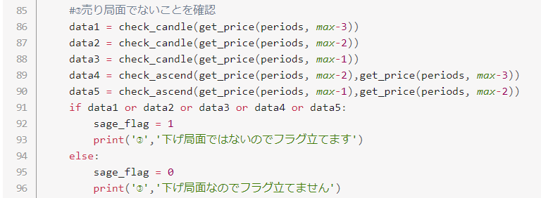簡易なロジックではありますが、直近3本の足がいずれも陰線、かつ始値、終値が前の足よりも減少していれば売り局面と今回は判断することにしました。売り局面でなければsage_flagを1にします。