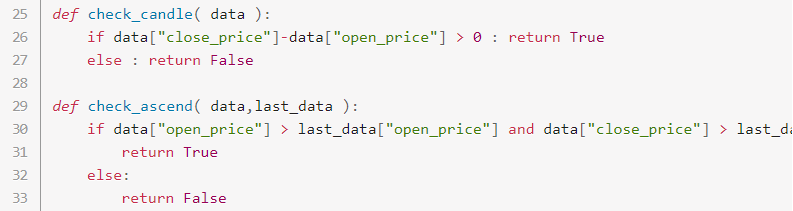 check_candleでは陽線か陰線か(始値と終値の大小を比較)を確認しています。陽線ならTrueを返します。check_ascendでは前後の足の始値の増減、終値の増減をそれぞれ確認しています。両者とも増加していればTrueを返します。