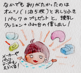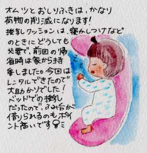 また、わたしの場合は授乳で寝かしつけをしているので、授乳クッションなしはきつい!また、ベッドでは高すぎて足がつかず、授乳しづらい!ということでこれらをレンタルすることができて、すごく楽でした。授乳クッションは、事前予約が必要とのことでした。